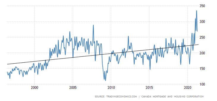 As mentioned above, the housing market in Canada is at never before seen levels. As of April 2021, the average house in Canada sold for $695,500. That is a year-over-year increase of 42% from April 2020. The number of houses selling has also increased markedly with more than 74,000 houses being sold in April of 2021. For a staggering year-over-year increase from April 2020 of 258%.